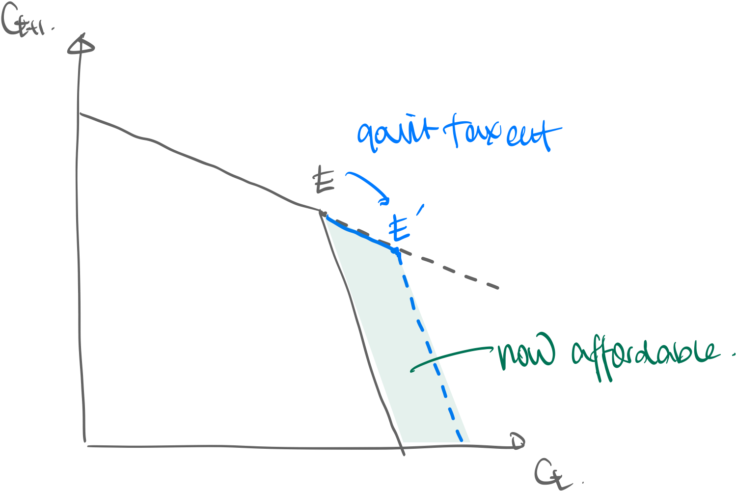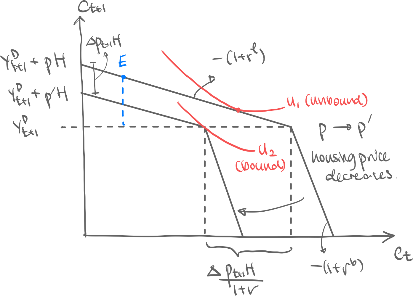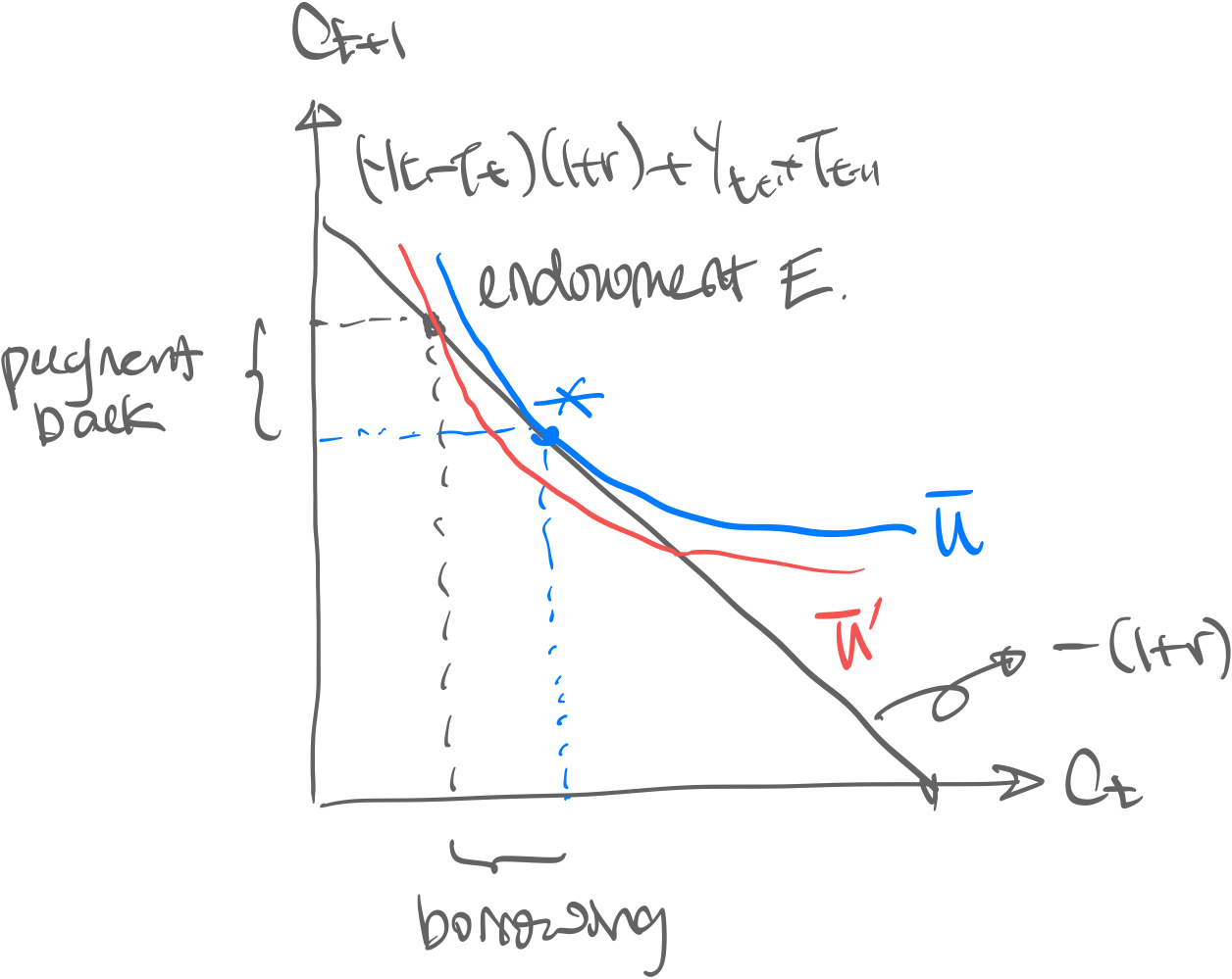 - Slope of the budget constraint is as derived from the lifetime budget constraint; simply because this is the rate at which you can trade current and future consumption Intuition. Financial markets allow a household to shift consumption forwards/backwards in time. this is called consumption smoothing. Remark. The household still has convex utility, meaning it has a taste for variety. This means often that households will try to balance current and future consumption Remark. thus at optimal