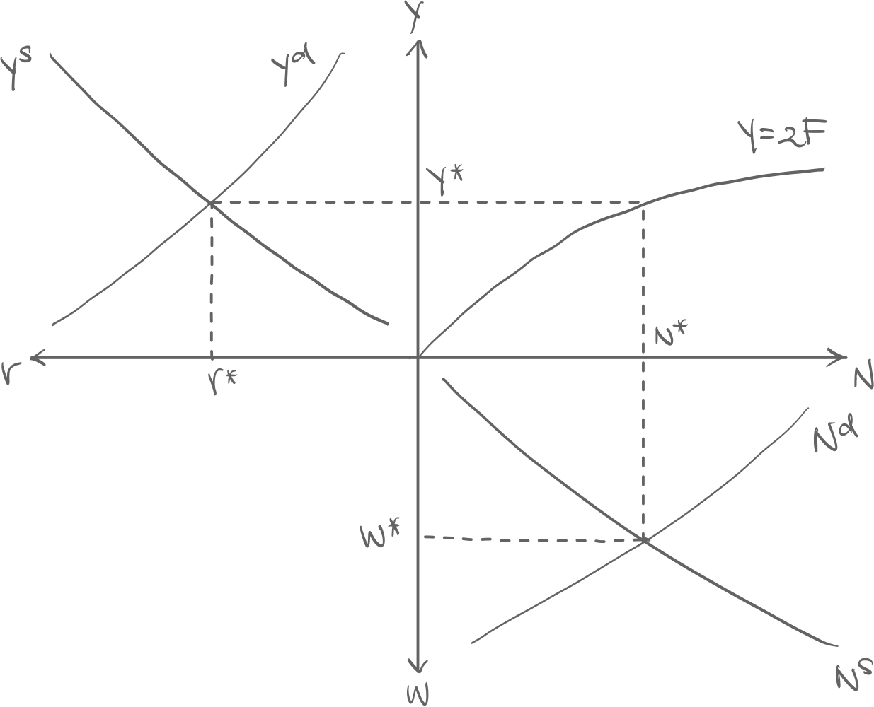Goods demanded is a combination of consumption and investment. Thus we have: where both and are inversely proportional to making also so. For time , we have the following general equilibrium in both the labor and goods markets. We list