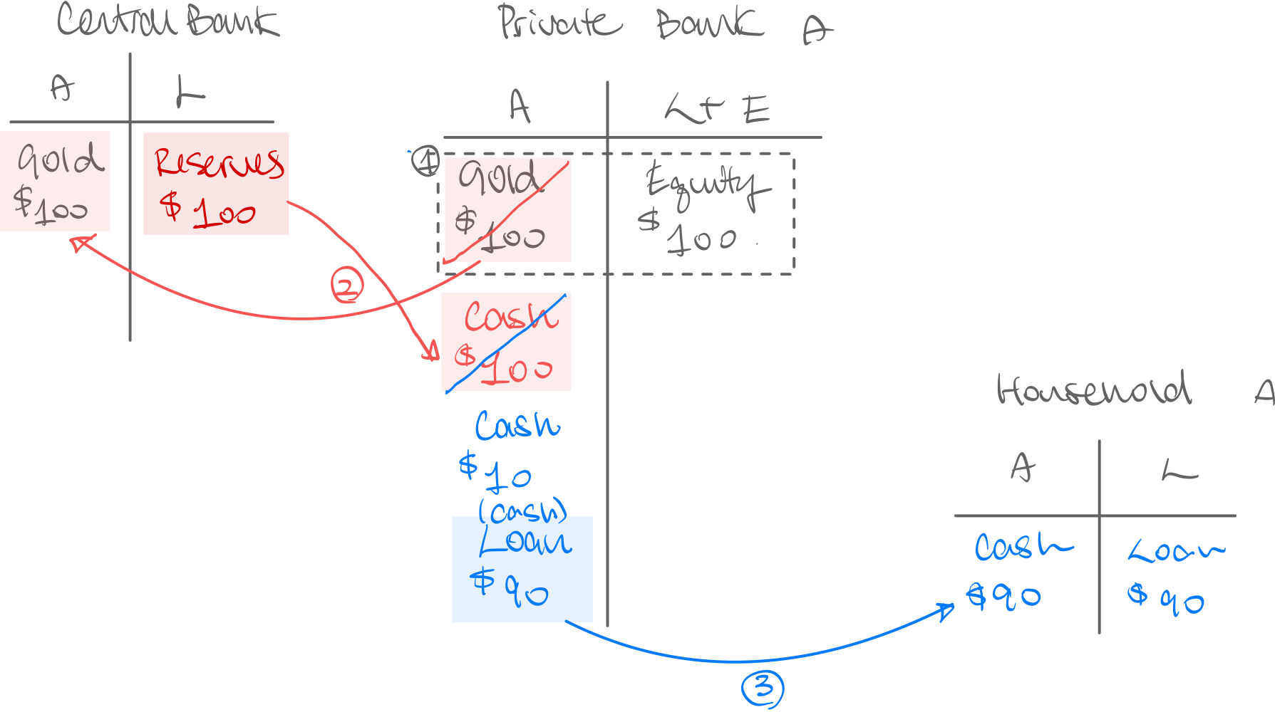 - Gold Standard: Central bank guarantees that you can give it cash and it will give you gold in return. Central bank is the only bank that can print money (=reserves)
