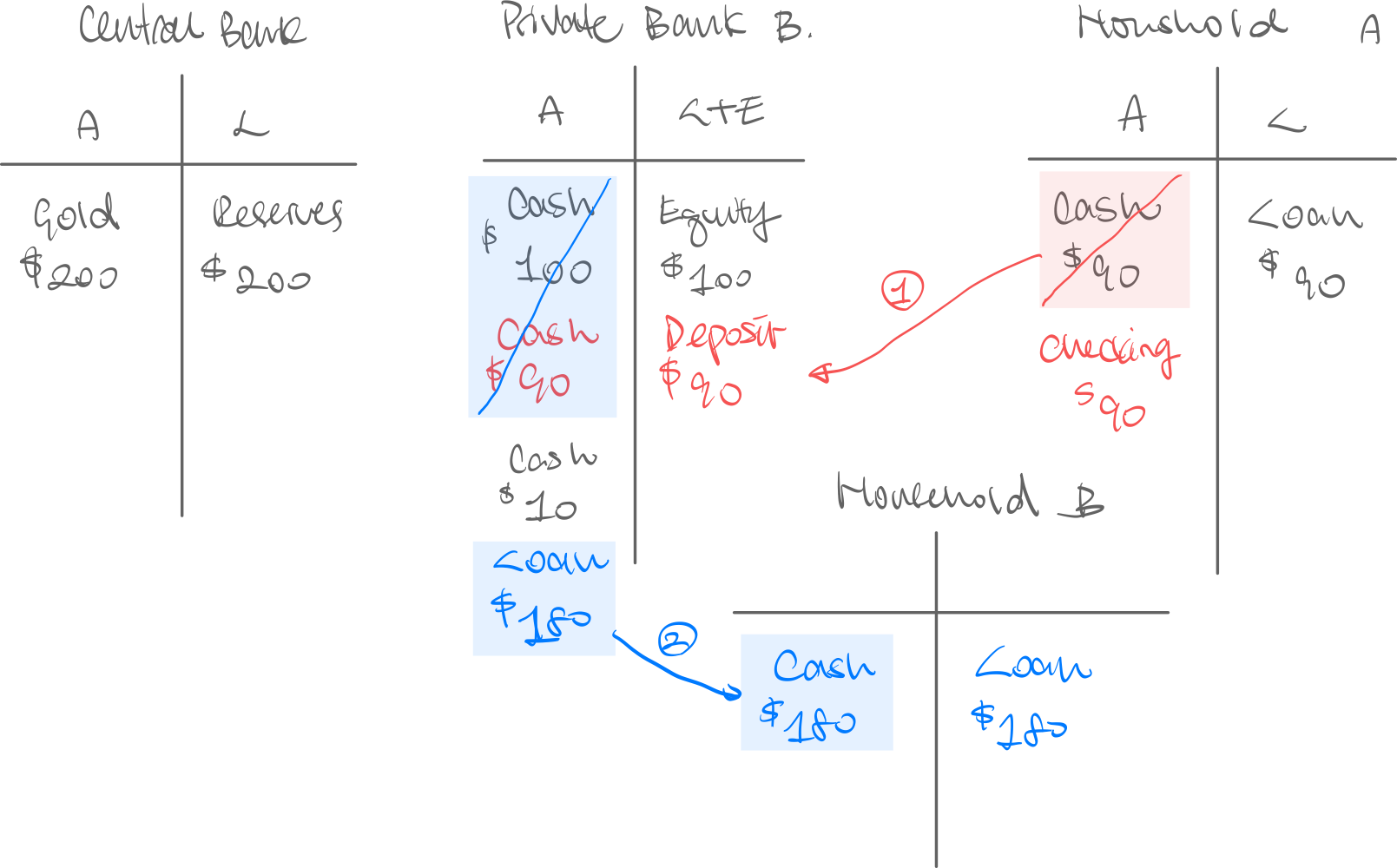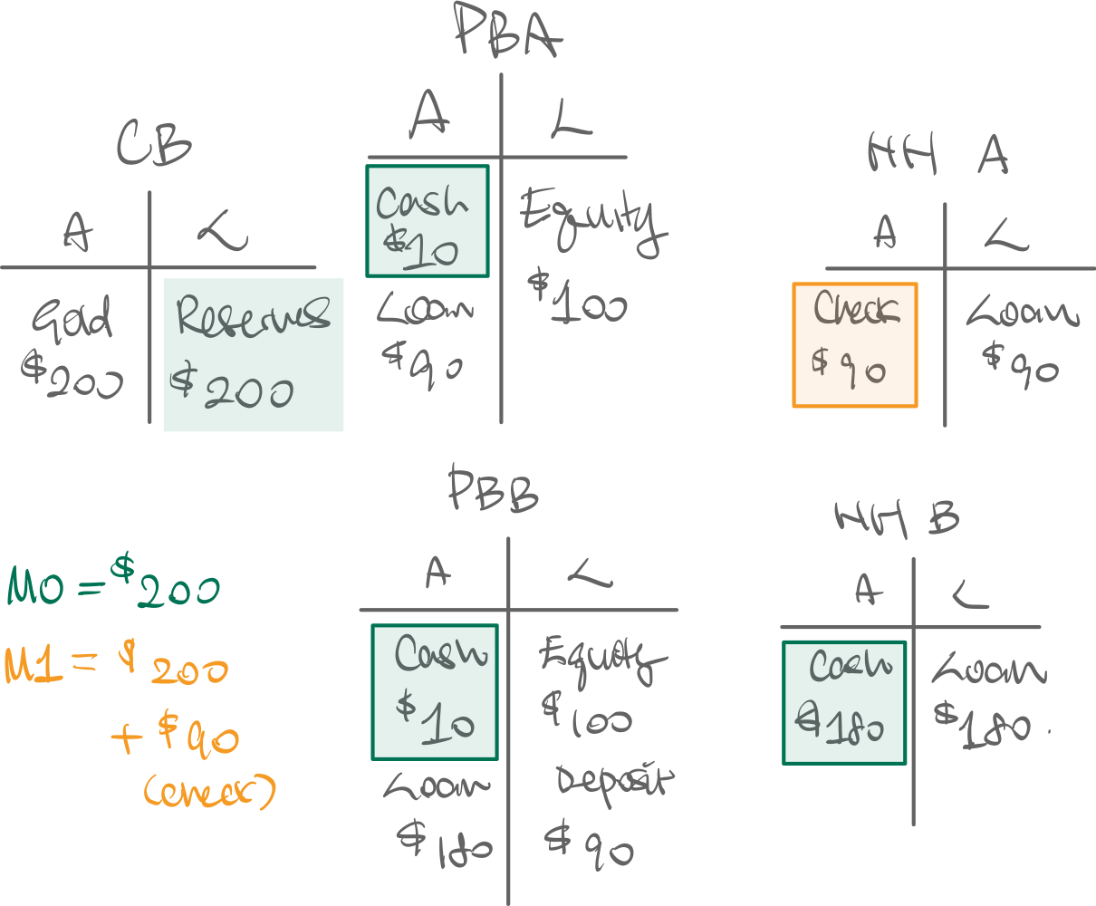 - HHB asks for loan of 90 in their deposit, which can be used in transactions. We therefore have two types of money in circulation: