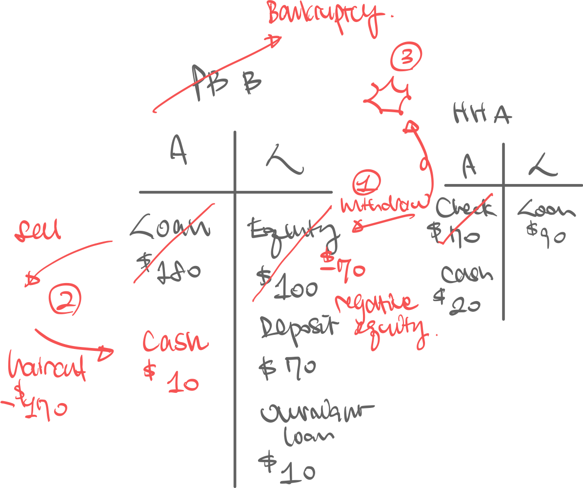 - In times of crises: 1. People withdraw more (bank run) 2. Sell loan at haircut → Bank equity decreases to match 3. If selling loans and cash and reserves can’t keep up with increasing liabilities we have bankruptcy 4. To prevent this: 1) Federal Deposit Insurance Company (FDIC) and 2) Required hold in reserves (~10%)
