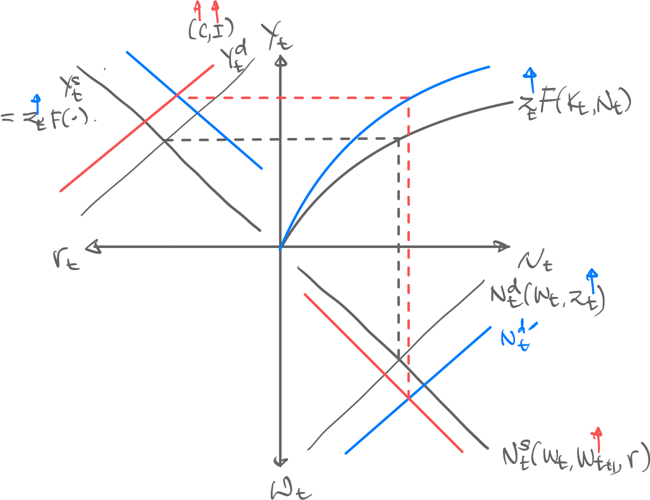 Observe that for the optimal investment decision, as increases, has to increase to too balance the equation, as is held the same. Also note that also increases Intuition. Firms want to invest in more capital since productivity of capital in the future will increase.
